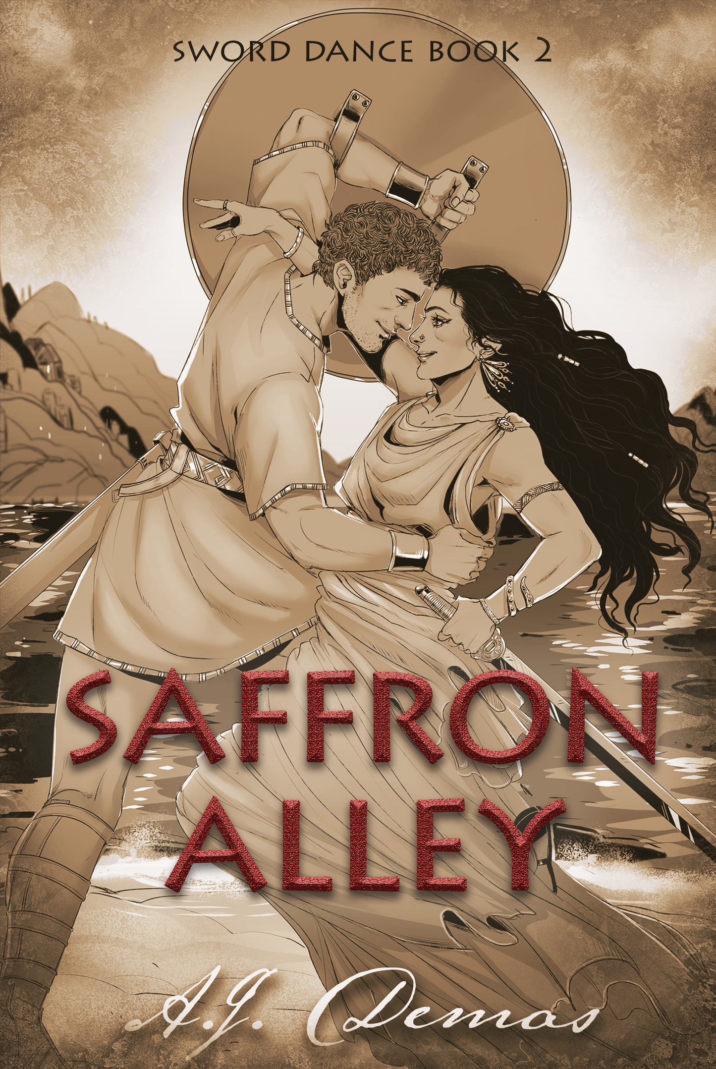 Saffron Alley is the second book in the Sword Dance trilogy, the continuation of Dami and Varazda’s story from Sword Dance. It crosses over with One Night in Boukos, but you don’t have to have read that book to enjoy this one.